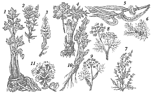 1. Сельдерей; 2. Иссоп; 3. Шалфей; 4. Дягиль; 5. Эвкалипт; 6. Можжевельник; 7. Полынь; 8. Тмин; 9. Фенхель; 10. Петрушка; 11. Тимьян.
