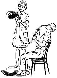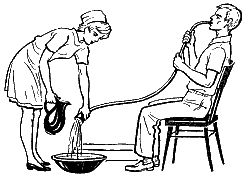 В некоторых случаях врач рекомендует промывание желудка «домашним способом» - без зонда. Эта лечебная мера основана на том, что большое количество слизи, вызывающее ряд болезненных ощущений (тяжесть в подложечной области, тошноту, слюнотечение), удаляют из желудка с помощью искусственно вызванной рвоты. Для этого в 4-5 стаканах теплой воды разводят немного бикарбоната натрия (половина чайной ложки питьевой соды на каждый стакан воды) (рис. 39, 40). Больной выпивает все 4-5 стаканов раствора, после чего, раздражая пальцами корень языка, вызывает рвоту. Иногда желудок промывают минеральными водами. Частоту промывания желудка определяет врач, она зависит от интенсивности процесса. При острых гастритах, связанных с отравлениями, и в некоторых других случаях, когда требуется уточнение диагноза, промывные воды оставляют для лабораторных исследований. Промывные воды собирают в чистую посуду и плотно закрывают, сохраняя в прохладном месте. Рис. 39. Промывание желудка (I этап). Рис. 40. Промывание желудка (II этап). После промывания желудка больному следует полежать 5-10 мин с теплой грелкой на животе. В грелку не нужно наливать много воды, чтобы она не была тяжелой. Вода в грелке не должна быть слишком горячей. Лучше прикладывать грелку не непосредственно к коже живота, а через прокладку, например через обычное полотенце, сложенное в 2 раза. |