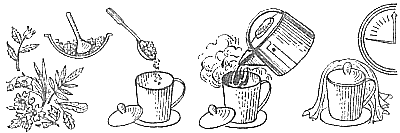 Лекарственные травы кладут в ситечко или просто в подходящую емкость и заливают кипящей водой. Затем накрывают сосуд крышкой и дают настояться в теплом месте 5—15 минут (в зависимости от рецепта).