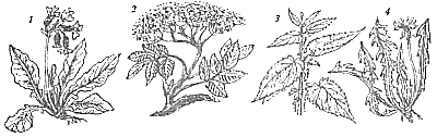 1. Первоцвет весенний; 2. Бузина черная; 3. Крапива двудомная; 4. Одуванчик лекарственный