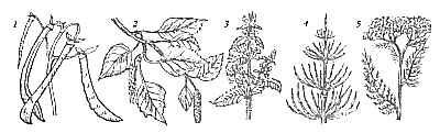 1. Фасоль; 2. Береза; 3. Мята перечная; 4. Хвощ полевой; 5. Тысячелистник