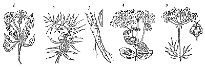 1. Одуванчик лекарственный. 2. Можжевельник. 3. Петрушка. 4. Заячья капуста, или очиток. 5. Анис